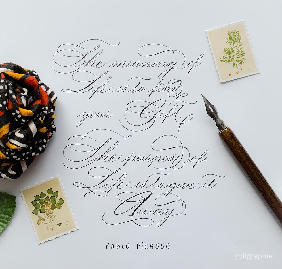 The meaning of lifeyoligraphieAug 17, 20211 min readDieses Zitat von Pablo Picasso gefällt mir sehr. "Der Sinn des Lebens besteht darin, deine Gabe zu finden. Der Zweck des Lebens ist, sie zu verschenken."